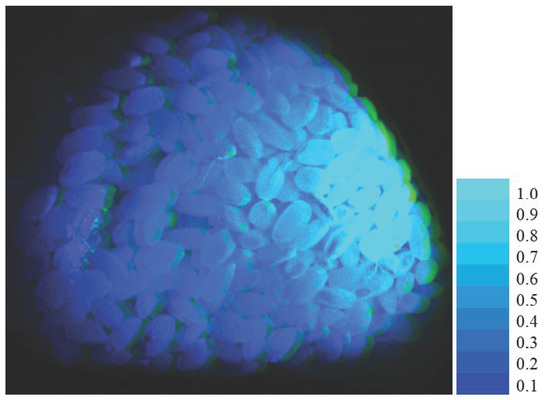 Figure 14 shows the visual appearance of the fluorescence emission rendered using the sRGB image of the rice grain object. In this figure, the scale [0, 1] represents the relative intensity, where 1.0 is the maximum value. The gray areas are those where no excitation light was illuminated, and no fluorescence was emitted.