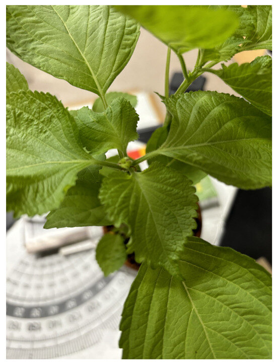 The images of the leaves “Ohba” of a living plant in a pot, as shown in Figure 15, were captured using the second imaging system. Ohba refers to the leafy part of “Green Shiso” (Perilla frutescens var. crispa), which is edible and sold on the market. Multiple images of Ohba leaves were obtained by sequentially changing the optical filters, which were then combined into a six-dimensional multiband image. Figure 16 shows an image of each channel observed using the imaging system with six bands.