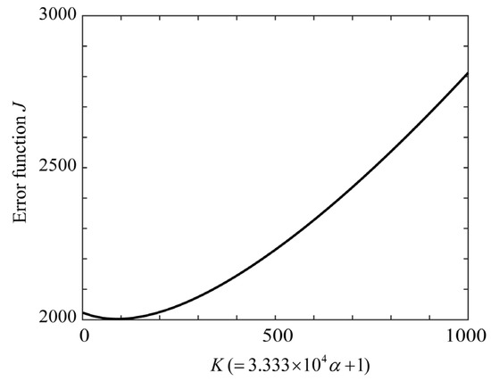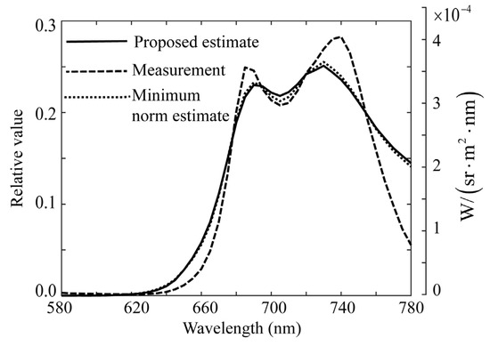 The proposed ridge method was used to estimate the spectral distribution of the fluorescence emitted from the plant leaves. Because the fluorescence emission from plant leaves has a spectral distribution in the red-to-far-red wavelength regions, spectral estimation was performed in the wavelength region of 580–780 nm. Figure 17 shows the error curve of function J, where the parameter K is related to the ridge parameter, as in (K = 1, 2., …, 1000). The K value and ridge parameter α that minimized J were K = 90 and α = 0.00267, respectively. Figure 18 shows the ridge estimation results, where the estimated is compared with the direct measurement . The estimation error of is 0.03294. The scale on the right represents the physical quantities measured using a spectroradiometer.