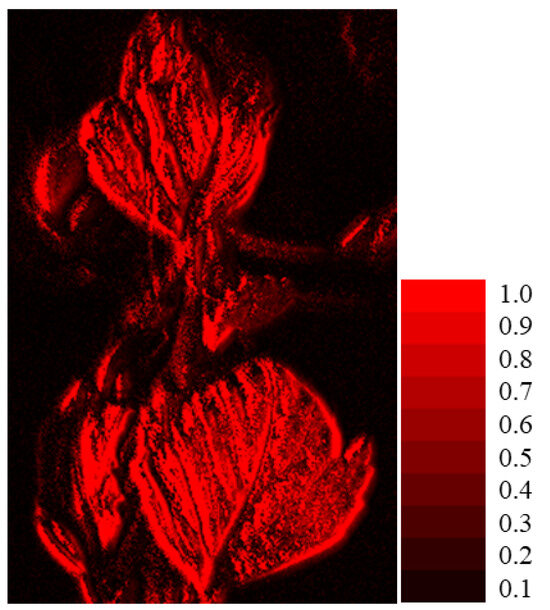 Furthermore, we rendered the visual appearance of the fluorescence emission from the entire object of the Ohba leaf as an image. The perceptual color was calculated as the sRGB value at all pixel points in the visible wavelength region. Figure 20 shows the visual appearance of the fluorescence emission rendered by the sRGB image with the fluorescent color of the leaf, where the [0, 1] scale represents the relative intensity, with a maximum value of 1.0.