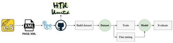 Figure 3 illustrates the adopted procedure to take an image of a historical document and produce the corresponding transcription. The manuscripts were initially annotated using the eScriptorium platform, and the annotated documents were exported using the PAGE XML format [20], and stored in a GitHub repository (available at https://github.com/Arch-W/iForal-Dataset, accessed on 19 December 2024). After a series of GitHub Actions to ensure quality control of the data, to facilitate model training, and to enable inclusion of the resulting dataset in the HTR-United catalogue. The dataset was then used for training, fine-tuning, and the evaluation of the developed models.