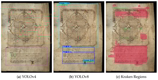 Figure 5a,c show that YOLOv4 and Kraken detections were far from perfect, as the models struggle with complex and distinctive document layouts. Using YOLOv8 (Figure 5b) improves the performance in these cases, as it correctly detects the text blocks and has much fewer miss-detections.
