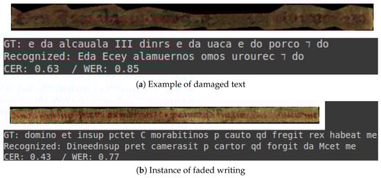 The initial two examples, depicted in Figure 7, exemplify a commendable level of transcription. Conversely, Figure 8a,b illustrate instances of transcription that deviate from this standard, which can be attributed to the intrinsic characteristics of the documents in question.