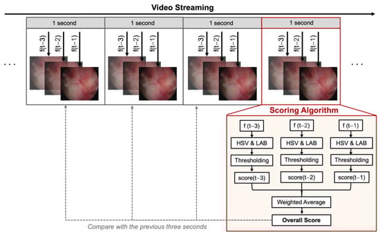 The pseudocode for the proposed algorithm and the block diagram are presented in Algorithm 1 and Figure 1, respectively. The system evaluates three random frames from each second (out of 24 frames per second), comparing the average score of each second to the previous three. Floating clot pieces or coagulated tissue that are closely visualized can instantaneously deceive the system imitating a local bleeding. However, the rule of comparing the score to three previous ones aims to limit the effect of a spontaneous red tissue artifact on the score. To achieve this, each video was duplicated to create a virtual “previous three seconds”, ensuring consistency and simulating real-time analysis. This approach allowed the system to effectively analyze a 6 s video consisting of two 3 s segments, replicating the evaluation of the original video’s final three seconds. Considering that even acute intense bleeding is gradual and should not increase the score abruptly, the system is programmed to check for another set of three frames if there is more than a 3-score increase within a second.