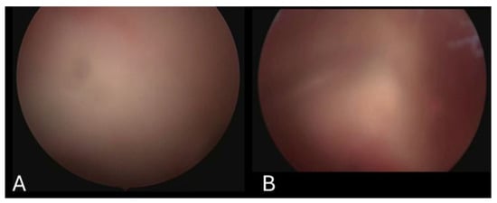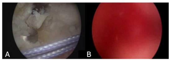 Arthroscopic images extracted from video clips scored as 3.17 (A) and 4.08 (B) by the system. In image (A), the background inflammation was not classified as bleeding, resulting in a low score of 3.
