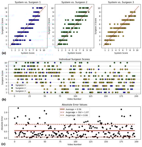 (a) Individual surgeons’ scores against the system-generated scores. (b) Individual scores of each surgeon for 200 video clips. (c) Absolute errors for 200 video clips.