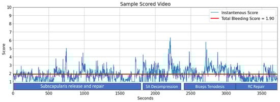 The system’s analysis report of a 62 min procedure. The total bleeding score is a novel parameter that indicates the average bleeding score of this arthroscopic rotator cuff repair procedure and calculated as 1.90/second. Ersin et al. previously reported that the occurrence of bleeding varies along different stages of an arthroscopic shoulder procedure []. Indeed, the total bleeding score is highest in subacromial decompression (2.28) and biceps tenodesis (2.26) phases of the surgery, while it is lowest in the final phase where the rotator cuff tendons are repaired (1.59).