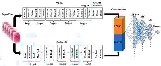 After resizing and applying different augmentation techniques, the input sample is sent to dual pre-trained CNN models, i.e., VGG16 and Resnet50. However, the adopted models are used without their final fully connected (classification) layers, which are re-sponsible for making predictions based on the features extracted from the earlier layers. It means that the final classification layers (which are usually used for the ImageNet classes) are detached. Furthermore, removing the top layer lets the remaining parts of the models (composed of convolutional and pooling layers) serve as powerful feature ex-tractors []. First, the fingerprint images are fed into the modified models; as the pictures of the fingerprint pass through the convolutional layers, each layer extracts gradually intricate features. The lower layers might capture elementary patterns (like edges), while the deeper layers capture more abstract features (like shapes and forms specific to fingerprints).