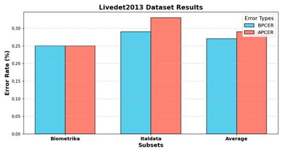 The results presented in Table 4 and Table 5, along with Figure 3, highlight the performance and error rates of different liveness detection methodologies on the Livedet2013 dataset. Table 5 shows that the proposed method achieves the highest average accuracy of 99.72% across the Biometrika and Italdata subsets. This outperforms other methods like the Gram model (98.95%) and Pre-trained CNN (98.45%). This indicates a significant improvement over earlier techniques, such as BP-ANN, Improved DCNN, and DRBM + DBM, which display lower accuracies, especially on the Italdata subset. Table 4 and Figure 3 provide error rate analyses, highlighting a balanced BPCER and APCER of 0.25% for the Biometrika subset. In contrast, for the Italdata subset, APCER reaches 0.33%, slightly higher than BPCER at 0.29%. This suggests that Italdata may contain more challenging spoof patterns. These patterns could affect the model’s performance in differentiating between bona fide and spoof fingerprints. The average ACE of 0.28% across subsets shows that although the state-of-the-art methods maintain reasonable error rates, the proposed method’s exceptional performance demonstrates enhanced robustness and reduced error rates. By combining VGG16 and ResNet50, our method leverages the detailed feature extraction of VGG16 and the hierarchical deep feature learning of ResNet50. This combination can capture a broader range of features, from fine details to complex patterns, enhancing overall accuracy. Other methods like the Gram model or Pre-trained CNN might rely on single architectures that do not capture the full range of features as effectively. For example, a single CNN might miss some hierarchical features that ResNet50 can capture. This highlights the effectiveness of the proposed methodology in accurately identifying genuine and spoof fingerprints across diverse data subsets.