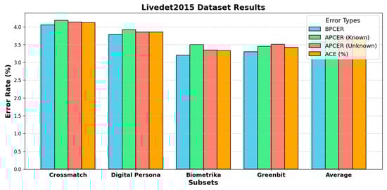Error rates (BPCER, APCER, ACE) for different subsets of the Livedet2015 dataset.