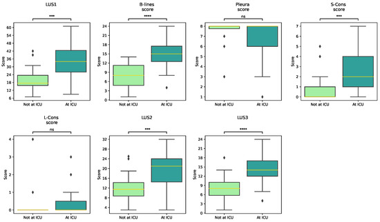 Boxplots of the distribution of all lung ultrasound scoring systems (LUS1; LUS2; LUS3; B-line score; Pleura score; Subpleural Consolidations (S-Cons) score; Lobar Consolidations (L-Cons) score; LUS score 2; LUS score 3)), according to ICU admission. Mann–Whitney Test: non-significant (ns): p > 0.05; ***: 0.0001 < p ≤ 0.001; ****: p ≤ 0.0001.