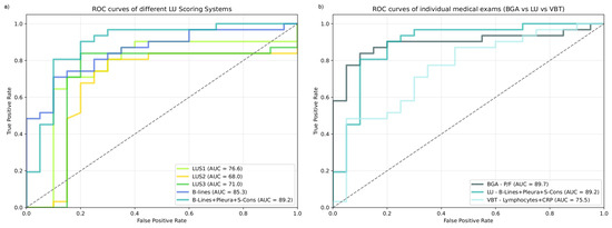 ROC curves of (a) the three total lung ultrasound (LU) scores (LUS1, LUS2, and LUS3), B-lines alone, and the best-performing model of LU (B-lines + Pleura + S-Cons), and (b) the best-performing models for each medical exam (blood gas analysis (BGA), lung ultrasound (LU), and venous blood tests (VTBs)).