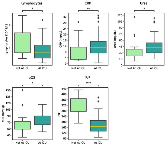 Boxplots of the distribution of lymphocytes, C-reactive protein (CRP), urea, and P/F values, according to ICU admission. Mann–Whitney Test: non-significant (ns): p > 0.05; *: 0.01 < p ≤ 0.05; **: 0.001 < p ≤ 0.01; ****: p ≤ 0.0001.