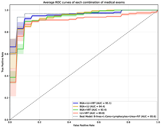 In terms of accuracy (92.2%) and PPV (93.5%), the BGA + VBT model outperforms the best LU + VBT and BGA + LU combinations. Regarding sensitivity, the BGA + LU combination achieve the highest result (96.8%). As for specificity, both BGA + VBT and BGA + LU achieve 90.0%, whereas the best LU + VBT model achieves 85.0%. Figure 5 displays the average ROC curve for the different combinations of medical exams (BGA + LU + VBT, BGA + LU, BGA + VBT, LU + VBT). For comparison, the ROC curve of the best-performing model in terms of accuracy, sensitivity, specificity, PPV, and NPV (B-lines + L-Cons + Lymphocytes + Urea + P/F) is also displayed. In terms of average AUC, it is shown that the combination of the three medical exams (BGA + LU + VBT) yields the highest results (AUC = 95.1%), sequentially followed by BGA + LU (AUC = 94.4%), BGA + VBT (AUC = 92.4%), and LU + VBT (AUC = 89.8%), respectively.