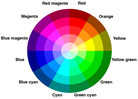 It is proposed to use cluster analysis of the color content of book covers to determine whether there are palettes that predominate in the design of books of certain genres. Color palette is a set of colors that a designer or artist chooses to work with on a project. It is convenient to create palettes using color wheels; the early wheels used RYB (Red, Yellow, Blue) primaries alongside secondary and tertiary colors [29,30,34,35]. Since designers use digital monitors that process images in the RGB model, color palettes are now more often influenced to use RGB (Red, Green, Blue) primaries (Figure 2).