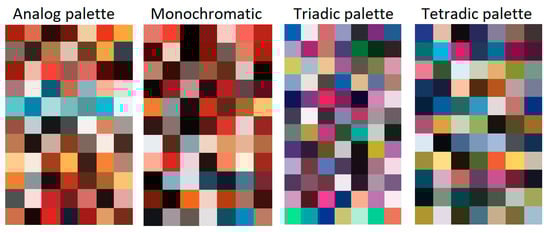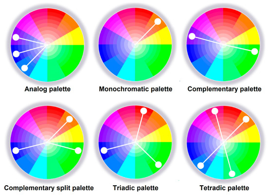 Palettes are formed by radius vectors, each of which corresponds to one color. The most famous palettes are analogous, monochrome, complementary, triadic, and tetradic (Figure 3).
