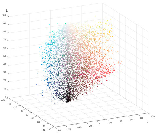 A slight concentration of dots in the dark part of the diagram can be noted. In the rest of the volume, the dots are distributed fairly evenly; however, green colors are underrepresented. In this array of points, k-means clustering was also carried out, and 30 most frequently repeated colors were identified. These colors and their LAB coordinates are shown in Figure 6.