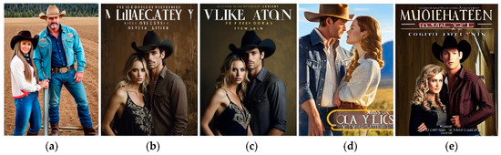 Dreamlike results for romance cover using models (a) Kandinsky 2.0 (General); (b) Dreamlike Photoreal 2.0 (Photorealistic); (c) Dreamlike Photoreal 2.0 (Photorealistic) with enhancing; (d) Neurogen 1.0 (General); and (e) Stable Diffusion 1.0 (General, base model).