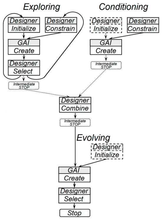 The process begins with defining the book’s genre, theme, and target audience. Color clustering based on machine learning shows most frequently used colors for a genre (if appropriate data are available). Based on this information, generative services can suggest initial layouts. The designer develops a prompt as a query for GAI tools. The designer (who is also considered the book author in self-publishing) launches the stages of Exploring styles and constraints, forming and initializing conditions and constraints for generation (Conditioning), then the GAI service forms a response to request and the designer selects the most suitable variants, combining them with additional conditions if necessary. Here, in the work process, small pauses (Intermediate Stops) are possible, associated with the need to comprehend the results obtained and make a decision on their compliance with the design goal set. Then, if additional conditions are present, the generative service is relaunched (Evolving), the designer selects suitable results, and the process ends. Designers then refine the outputs, incorporating specific imagery, typography, and branding elements to ensure alignment with the book’s tone and narrative.