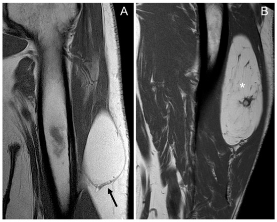 Figure 1. Coronal T1 weighted (T1W) images: (A) homogeneous lipomatous (completely fatty) tumor in the left arm (arrow), and (B) heterogeneous lipomatous mass in the left thigh, with one non-fat nodule (*) and multiple septa. The diagnosis for both tumors is lipoma, confirmed as MDM2 negative.