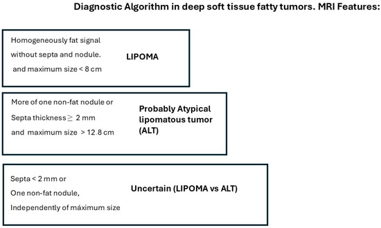 We propose the following approach for managing deep fatty soft tissue tumors based on their MRI characteristics, as illustrated in Figure 3. When a fatty tumor demonstrates homogeneous fat signal intensity, lacks septa and non-fat nodules, and has a maximum dimension of less than 8 cm, it is most likely a lipoma. Conversely, when a deep fatty tumor exhibits septa ≥ 2 mm, more than one non-fat nodule, and a maximum dimension greater than 12.8 cm, it is most likely an ALT. Additionally, if MRI reveals a fatty soft tissue tumor with heterogeneous signal intensity, septa < 2 mm, or a single non-fat nodule—regardless of the tumor’s maximum size—a biopsy with MDM2 determination is required to characterize the tumor before initiating treatment.