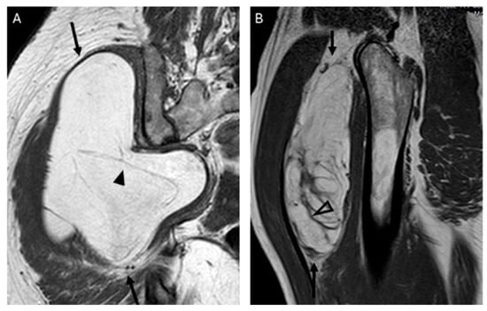 Figure 5. Septations. Coronal T1W image (A) showing a lipomatous tumor (black arrows) with thin septa < 2 mm (arrowhead) in the gluteal region. Final diagnosis: lipoma (MDM2 negative). Sagittal T1W image (B) showing a lipomatous tumor (black arrows) with thick septa ≥ 2 mm (open arrowhead). Final diagnosis: atypical lipomatous tumor (MDM2 positive).