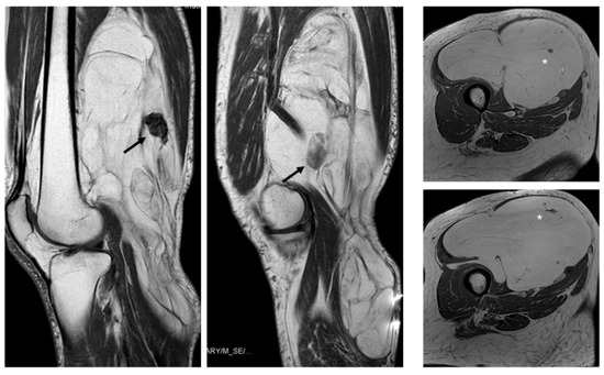 Figure 6. Nodules. Sagittal T1W images show a deep lipomatous mass in the popliteal fossa, measuring 27 cm along its long axis and with two non-fat nodules (arrows) Diagnosis: ALT (MDM2 positive). Axial T2W images present a lipomatous tumor in quadriceps, with two non-fat nodules (asterisks) Diagnosis: ALT (MDM2 positive).