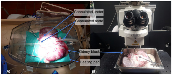 (A) Shows the Visible Kidney apparatus: the renal block is maintained in a modified OCS™ Lung housing capsule (TransMedics Inc., Andover, MA, USA). The kidney block rests on a heating mat and is connected to a pulsatile flow system continuously running oxygenated perfusate. The cannulated ureter allows for continuous urine output measurements. The tube cannulating the proximal aorta (right) carries the oxygenated perfusate. The distal tube cannulating the distal aorta (left) provides access for renal denervation catheters. (B) Next, the given kidney block was positioned under multiphoton microscope, partially submerged.
