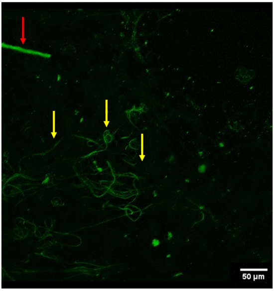 Conglomerate of what appear to be elastin fibers (yellow arrows) in the arterial vessel wall (viewed from autofluorescence). Also noted was a singular nerve fiber (red arrow) in the periphery of the field of view.