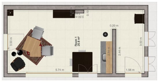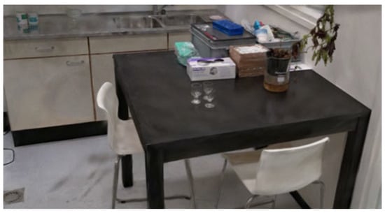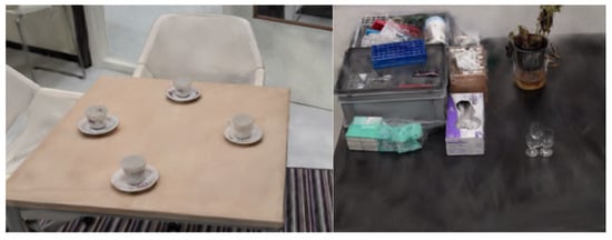 The experimental setup consists of a living room, kitchen, and hallway with several key features, such as tables, chairs, tableware, closets, ceiling, and lamps. These elements were chosen to provide a diverse set of objects with different geometric and textural information for the 3D-GS. The floor plan of the room is displayed in Figure 1, which illustrates the arrangement of the environment used in the experiments.