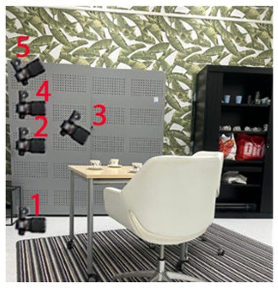 Based on preliminary research, the importance of capturing an environment at various heights has been identified. For methods 1 to 10, we utilized a 3-layer technique, with cameras positioned at 0.3 m, 1 m, and 1.7 m. This approach allows for more comprehensive data capture, leading to a better overall picture of the environment and improved 3D reconstruction. However, capturing the environment with more layers does increase the time required. The test aims to examine the difference in 3D reconstruction quality when capturing the environment with 1, 3, or 5. The same object/zone was filmed using identical settings and setup, but the number of layers was varied. The 5 passes that have been taken are shown in Figure 3. For 1 pass we used camera pose 3, for 3 passes we used 1, 3, and 4, for 5 passes we used all 5 of them.