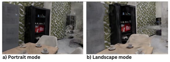 Camera orientation also plays a pivotal role in the quality of 3D reconstructions. While portrait and landscape modes offer unique advantages, landscape orientation is generally preferred for its broader field of view and greater horizontal overlap. This observation is supported by principles in photogrammetry, which emphasize the importance of maximizing overlap for better feature recognition []. Our results reinforce this understanding, with landscape mode consistently yielding superior reconstructions compared to portrait mode, especially for horizontally expansive environments.