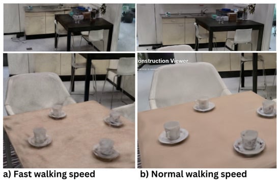 During filming, the camera operator navigates through the environment to collect data. If the camera operator moves too quickly, some video frames may become blurry because the autofocus cannot keep up. This test aims to examine the impact of blurry frames on 3D reconstruction. The difference in movement speed was assessed by comparing video lengths. Specifically, the duration of the video recorded at a slower movement speed is expected to be twice as long as the video recorded at a faster movement speed.