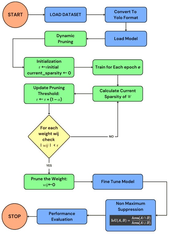 The proposed model of YOLOv8 was enhanced with the help of magnitude-based dynamic pruning. This allows for enhanced efficiency by selectively removing weights or neurons with the smallest magnitudes during training. A pruning method can be found in Algorithm 1 which makes use of sparsity as a parameter to implement the same conditions. Pruning improves efficiency by eliminating unnecessary weights. The inputs include the initial pruning threshold (τinitial), target sparsity (Starget), total epochs (E), the pruning interval (P), and the decay rate (α). During training, weights below a dynamically adjusted threshold are pruned, leading to a sparser network. The pruning is repeated periodically, and the network is fine-tuned to maintain its performance while minimizing unnecessary complexity. This approach reduces model size and computational complexity without significantly losing accuracy. Dynamically adjusting the pruning strategy helps maintain a balance between performance and efficiency, optimizing the model’s resource utilization. Such an approach to the proposed model would allow it to become more refined and robust in terms of training and performance. Further improvement to the robustness of the architecture and the object detection algorithm includes the usage of non-maximum suppression (NMS). NMS is employed to refine object detection results by eliminating redundant bounding boxes. It retains the most confident detection while discarding overlapping boxes, thus reducing false positives and improving detection precision. Together, magnitude-based dynamic pruning and NMS significantly enhance YOLOv8’s performance, making it more efficient and accurate for high-altitude infrared thermal object detection.