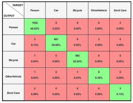 Comparing the model with the original images in terms of the classification and confidence percentage, the figures below show the original label and the prediction of the model. The assessment of the model utilizing precision, recall, and F1-score effectively underscores its overall performance. Nevertheless, it has been noted that specific classes, such as the ‘Don’t Care’ category, exhibit a decrease in detection accuracy relative to other categories like ‘Person’ or ‘Car’. This discrepancy can be ascribed to the inadequate instances of the ‘Don’t Care’ class, which probably resulted in insufficient representation during the training phase. The inherently ambiguous nature of this class complicates the model’s ability to establish precise boundaries and attain elevated confidence levels during classification.