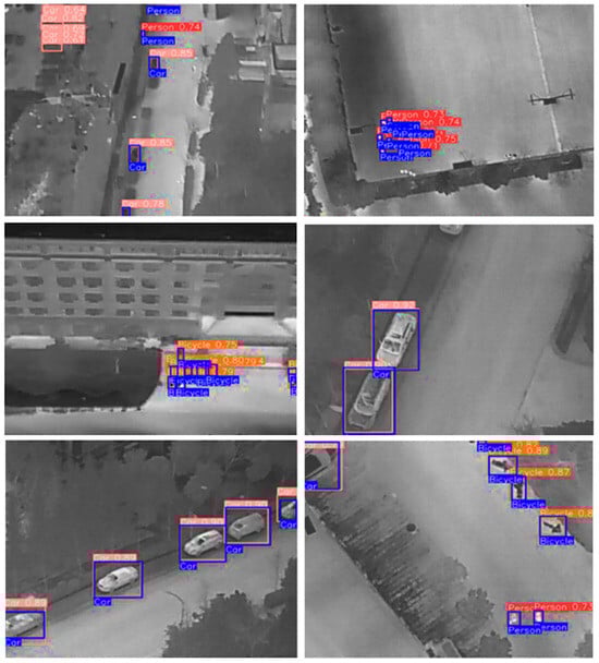 Environmental factors like heavy fog or rain introduce noise and occlusions in images, which can severely impact the detection and classification accuracy of object detection models like YOLOv8. These situations call for strong feature extraction skills and modifications to the model’s training procedure. In theory, by exposing the model to a variety of situations and adding extra data augmentation methods like simulating fog or rain effects during preprocessing, we can improve the model’s resilience. The domain adaptation principle, which teaches models to generalize across a range of environmental conditions, is in line with this strategy. Johansen et al. [] explored how weather conditions influence object detection in thermal imagery. They proposed a novel approach to estimate weather parameters, aiming to improve detection accuracy under varying conditions. Bao et al. [] introduced the dual-YOLO framework, which integrates data from both infrared and visible imagery to enhance object detection capabilities. Kim et al. [] addressed the challenge of detecting small objects in infrared images by using domain adaptation techniques to mitigate the issue of cross-domain data imbalance. Similarly, Xi et al. [] developed IRSDet, a neural network architecture featuring sparse-skip connections and guide maps, specifically tailored for improving the detection of small objects in infrared imagery.