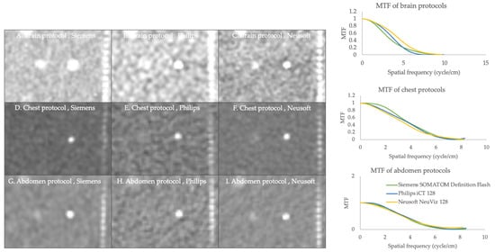 Figure 1. A comparison of the modulation transfer function of brain, chest, and abdomen protocols with various CT scanners. The small wire (indicated by the white dot in the axial image) is used to calculate MTF. The green, blue, and yellow lines represent the Siemens SOMATOM Definition Flash, Philips iCT128, and Nuesoft NeuViz 128, respectively.