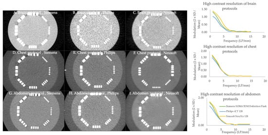 The high-contrast resolution is illustrated in Figure 2. In the brain protocol, the Nuesoft CT scanner demonstrated superior performance at low frequencies, diminishing differences among the scanners at higher frequencies. Similarly, in the chest protocol, the Siemens and Neusoft scanners exhibited slightly higher modulation at lower frequencies than the Philips scanner. At the same time, all systems performed comparably at higher frequencies. In the abdomen protocol, the Neusoft and Siemens scanners marginally outperformed the other scanners at low to intermediate frequencies.