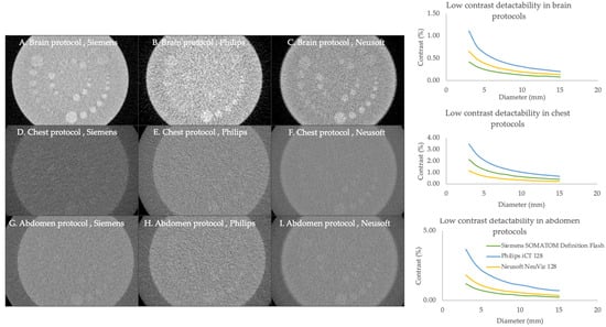 LCD is shown in Figure 3. In the brain and abdomen protocols, Siemens consistently exhibited superior detectability at the lowest contrast in the 3 mm diameter of the object, followed by Neusoft and Philips, while the Neusoft scanner performed better than the other CT scanners in chest protocol, which detected the smallest object of 3 mm in the lowest percentage contrast.