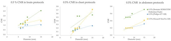 The contrast-to-noise ratio (CNR) for a 0.5% contrast object is presented in Figure 4. Siemens demonstrated the highest CNR across a wide range of object diameters. Neusoft exhibited moderate performance, while Philips consistently showed the lowest CNR in all the protocols.