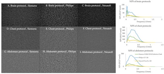 The noise power spectrum (NPS) provides a comprehensive description of the noise properties by measuring the magnitude and spatial correlation of noise, often called texture (Figure 5). In the brain, chest, and abdomen protocols, the Philips CT scanners demonstrated the highest noise magnitude compared to Siemens and Neusoft. Table 8 shows the peak NPS frequency and average frequency, which indicates the noise texture of an image. The NPS curves show a different texture shape between the three CT scanners with various protocols. It was found that Philips CT scanners exhibited the highest peak NPS frequency in the chest and abdomen protocol, while the brain protocols showed the same peak NPS frequency. The average frequency in Siemens exhibited the lowest frequency in all protocols and scanners.