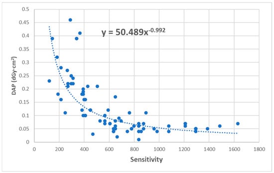 Based on the trendline in Figure 2, we conclude that the DAP and S index parameters are inversely proportional. This conclusion aligns with the manufacturer’s relationship, where the exposure index for the mobile X-ray unit FDR Nano FUJIFILM is inversely related to the exposure [18].