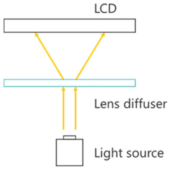 To address this problem, we previously proposed a ghost removal method using a lens diffuser [14]. In this method, the light rays that form ghosts are not removed but are instead formed as an aerial image, thereby removing the ghosts and improving the brightness of the aerial image. A lens diffuser limits the diffusion of light to a specific range using the diffusion function of a minute, random lens array [16]. A lens diffuser diffuses light within a certain range centered at a position with a normal direction of 0° and is designed such that light rays with an angle of incidence of 0° have the highest luminance. Figure 3 shows the principle of the ghost elimination method using a lens diffuser, in which light from the light source diffused by the lens diffuser is transmitted to the LCD.