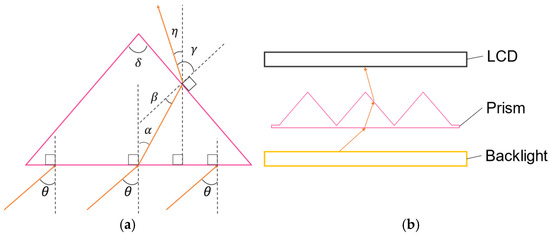As shown in Figure 4a, let θ be the angle of incidence to the flat side of the prism, be the angle of emission from the flat side of the prism, be the angle of incidence to the apex of the prism, be the angle of emission from the apex of the prism, and be the angle of deviation of the emitted light from the vertical direction. The refractive index of air is 1 and that of the prism is . The amount of incident light that is refracted is calculated based on Snell’s law [17] using the following Equation: