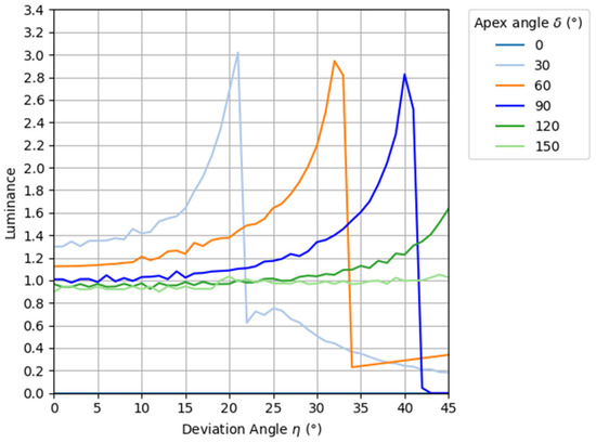 From the above Equations (7) to (14), the simulation results of the luminance of light passing through the prism at each angle can be shown in Figure 7. Here, the simulation was performed over the same range of apex angles as in Figure 5, and the luminance of light rays incident on the prism was set to 1 regardless of the angle. The vertical axis represents the luminance of rays emitted from the prism, and the horizontal axis represents the angle of exit from the prism.