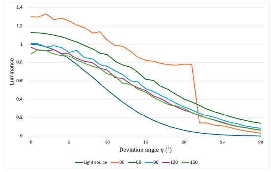 As shown in Figure 7, the brightness of the prism improves as the declination increases within a viewing angle of 20° of the aerial image. Therefore, the luminance distribution is not in the shape of a normal distribution as in the louver and lens diffusion of conventional methods, and the peak of the luminance distribution of the light source is not emphasized. In other words, it is thought that the use of prisms can lead to the reduction of uneven luminance of aerial images. Here, considering the angular range of incident light on the MMAP, which tends to contribute to ghosting, we consider a normally distributed light source whose luminance is zero at 30°. The superimposed distribution of this light source and prism is shown in Figure 8.