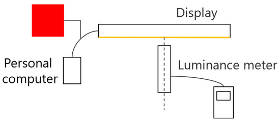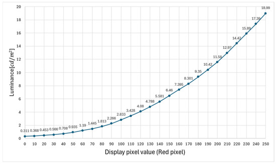 The luminance meter owned by the authors could not directly measure the luminance of an aerial image because the luminance must be measured by contacting the object to be measured. Therefore, we considered the camera as a pseudo-luminance meter. By measuring the relationship between the luminance value of the display, which is the light source, and the pixel value of the image, the luminance can be calculated from the pixel value of the image captured by the camera. In a previous study, we conducted experiments with red pixels, with the display luminance set to the maximum and contrast set to standard values, with pixel values ranging from 0 to 250 in increments of 10. Figure 9 shows the arrangement of the experimental apparatus used to measure the luminance of the display when viewed from the vertical direction. Because the display used for the measurements was the same as that used in a previous study, the measurement data recorded in the previous study were used in the present study [14]. The measurement results are shown in Figure 10.