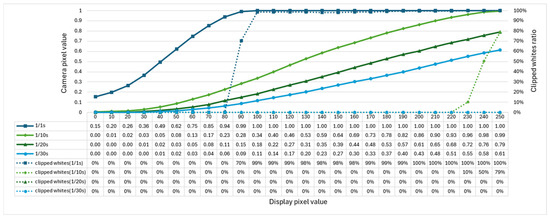 Because the pixel values of acquired images could not be accurately determined owing to the presence of whiteouts depending on the luminance of aerial images, the camera shutter speeds were set to 1/1 s, 1/10 s, 1/20 s, and 1/30 s. Because the images were captured in a dark room, the aperture was set to f/3.5 and the ISO sensitivity was fixed at 100, which is the lowest value available. The results are presented in Figure 11. The vertical axis in Figure 11 shows the pixel values of the captured images normalized from 0 to 1, and the horizontal axis shows the red pixel values on the display.