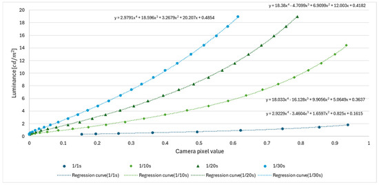 Figure 12 summarizes the results of the relationship between the pixel values of the camera and the luminance values of the luminance system for each shutter speed.
