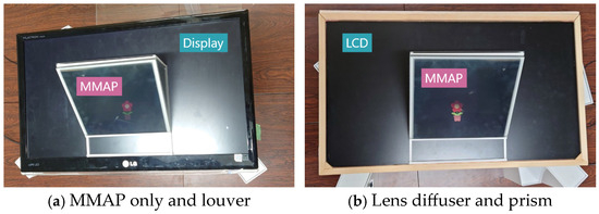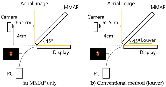 To verify the effectiveness of the proposed method, we compared the brightness of the aerial images and ghosts of the MMAP only, the conventional method with louvers and lens diffusers, and the proposed method. Figure 13 shows the experimental setups used for MMAP only and louvers, and for lens diffusers and prisms. Figure 14 shows the experimental setup for each method viewed from the side.